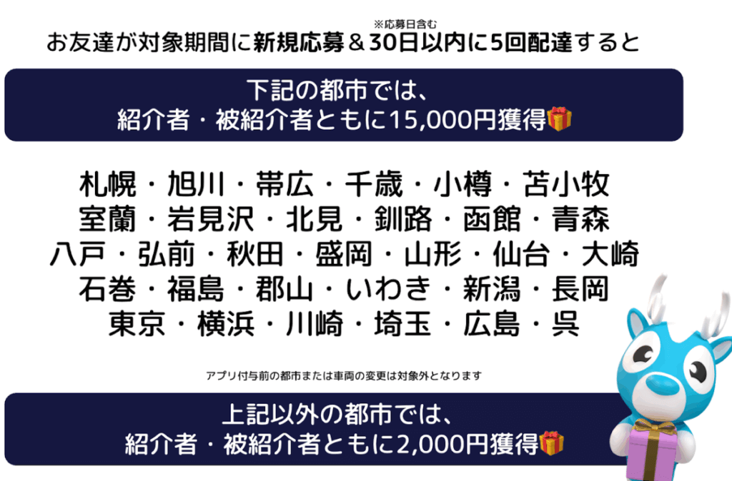 紹介コードを利用し、期間内に新規応募後&30日以内に5回配達で2,000円~15,000円(エリアにより異なる)が紹介者・登録者双方に支払われます。