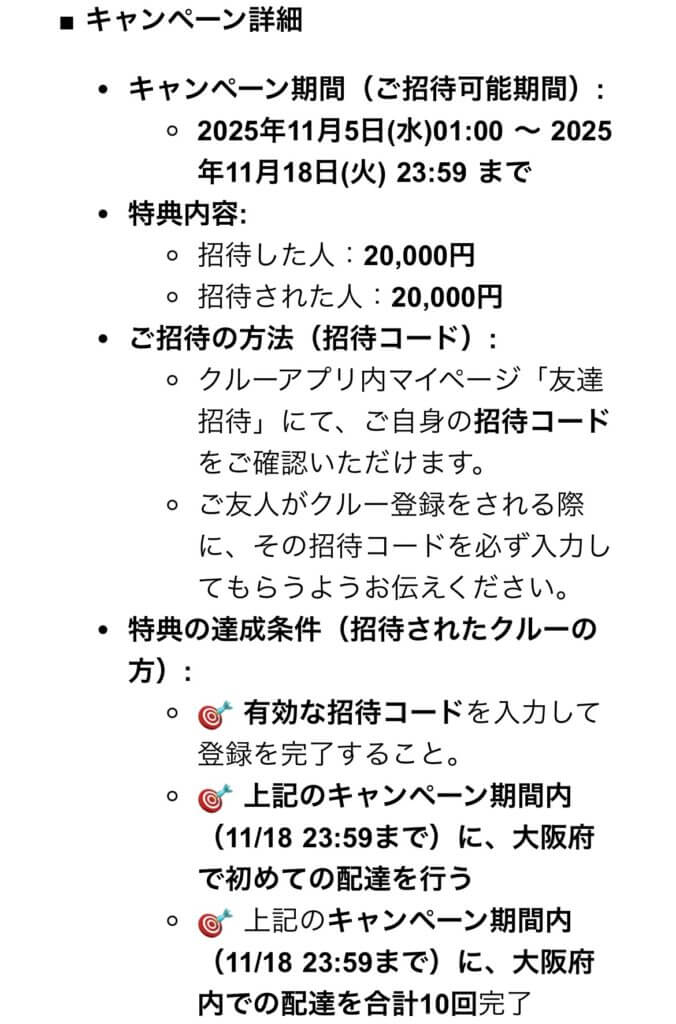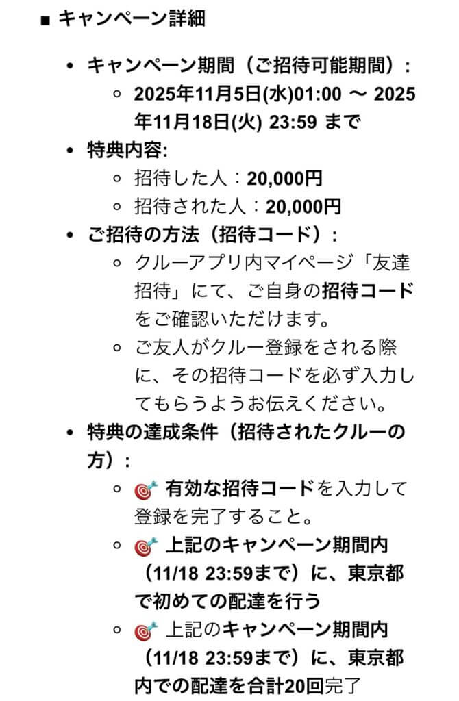 要約すると期間内にコードを使い新規登録&同期間内に対象エリア内での初配達および10回~20回(大阪・東京で異なる)の配達完了で20,000円が招待者(登録者)・紹介者の双方に!