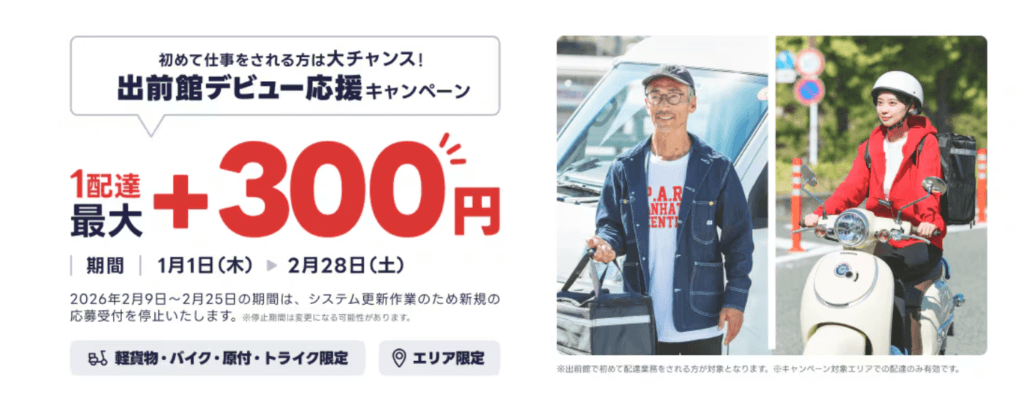 出前館では2026年1月~2月にエリア&車両限定でデビュー応援キャンペーンを開催