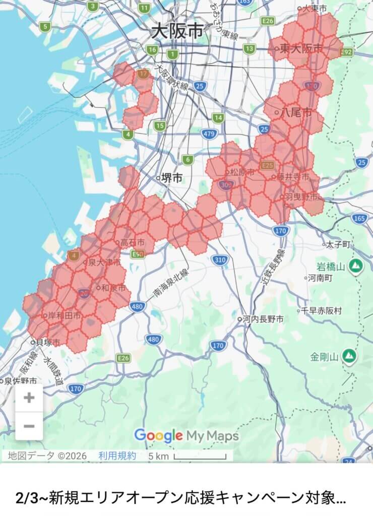 大阪市内はほぼ全域対応で、大阪府としても北摂~岸和田まで広範囲で利用が可能になりました。