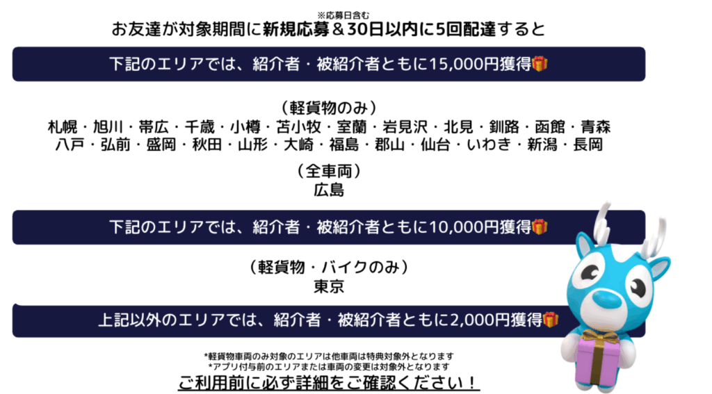 紹介コードを利用し、期間内に対象エリア・車両にて新規応募&30日以内に5回配達で2,000円~15,000円が紹介者・登録者双方に支払われます。