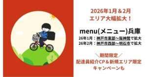 余談ですが、他社フードデリバリーのmenuでは2026年1月、2月(※予定)に兵庫県で大幅にエリア拡大しています。