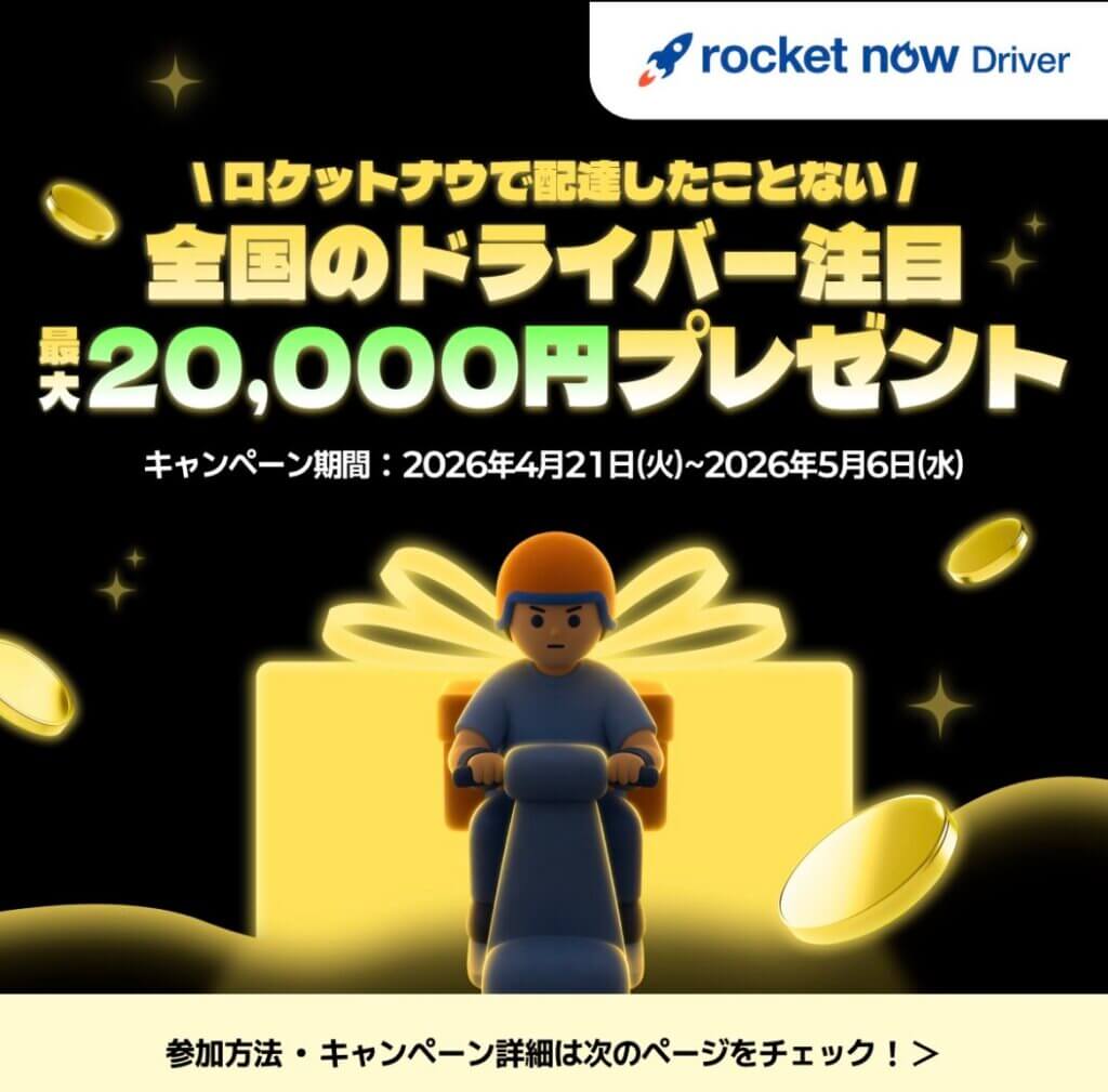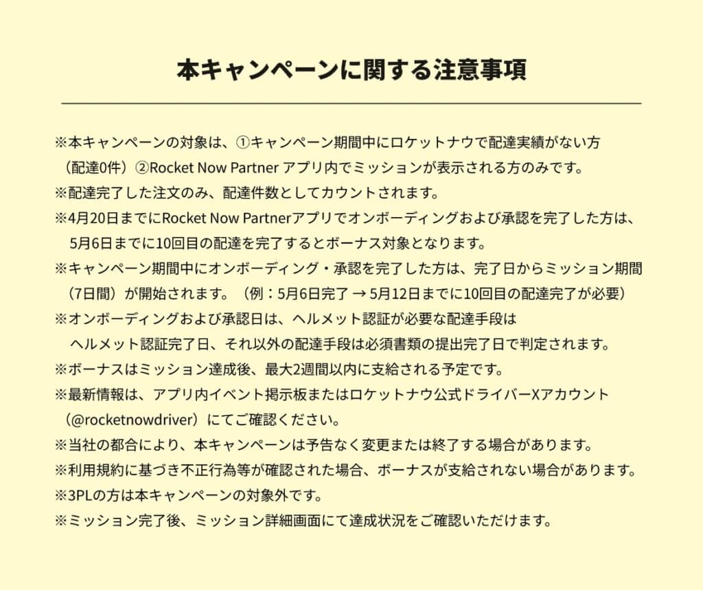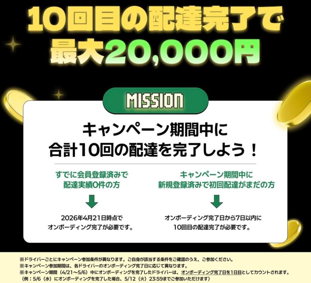 ちなみに4月21日~5月6日に全国で開催される下記の別キャンペーンも(新規登録完了から7日以内に10回配達)を考慮すると配達員登録はサービスが始まるギリギリ(1日~2日前)がオススメです。