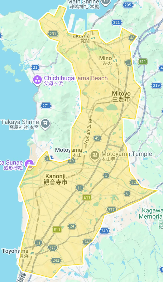 2026年3月のエリア拡大で観音寺市・三豊市の以下の範囲(MAP黄色部分)で利用が可能になりました。